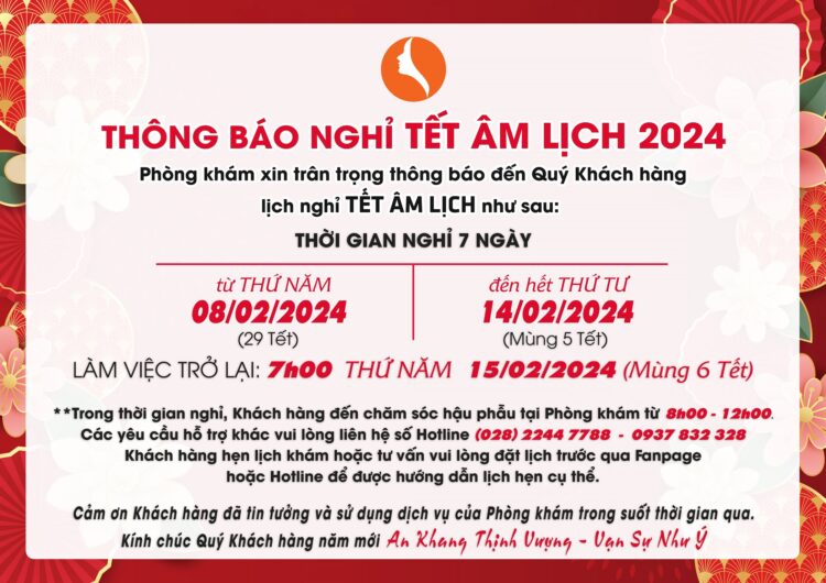 Phòng khám CK PTTM Ts – Bs Nguyễn Thành Nhân xin trân trọng thông báo lịch nghỉ TẾT ÂM LỊCH 2024 như sau: