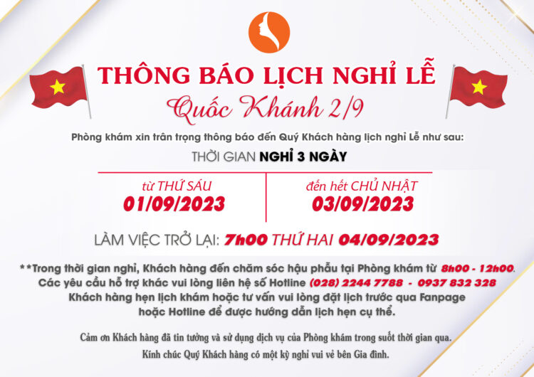 Phòng khám CK PTTM Ts – Bs Nguyễn Thành Nhân xin trân trọng thông báo lịch nghỉ lễ Quốc Khánh 2023 như sau: