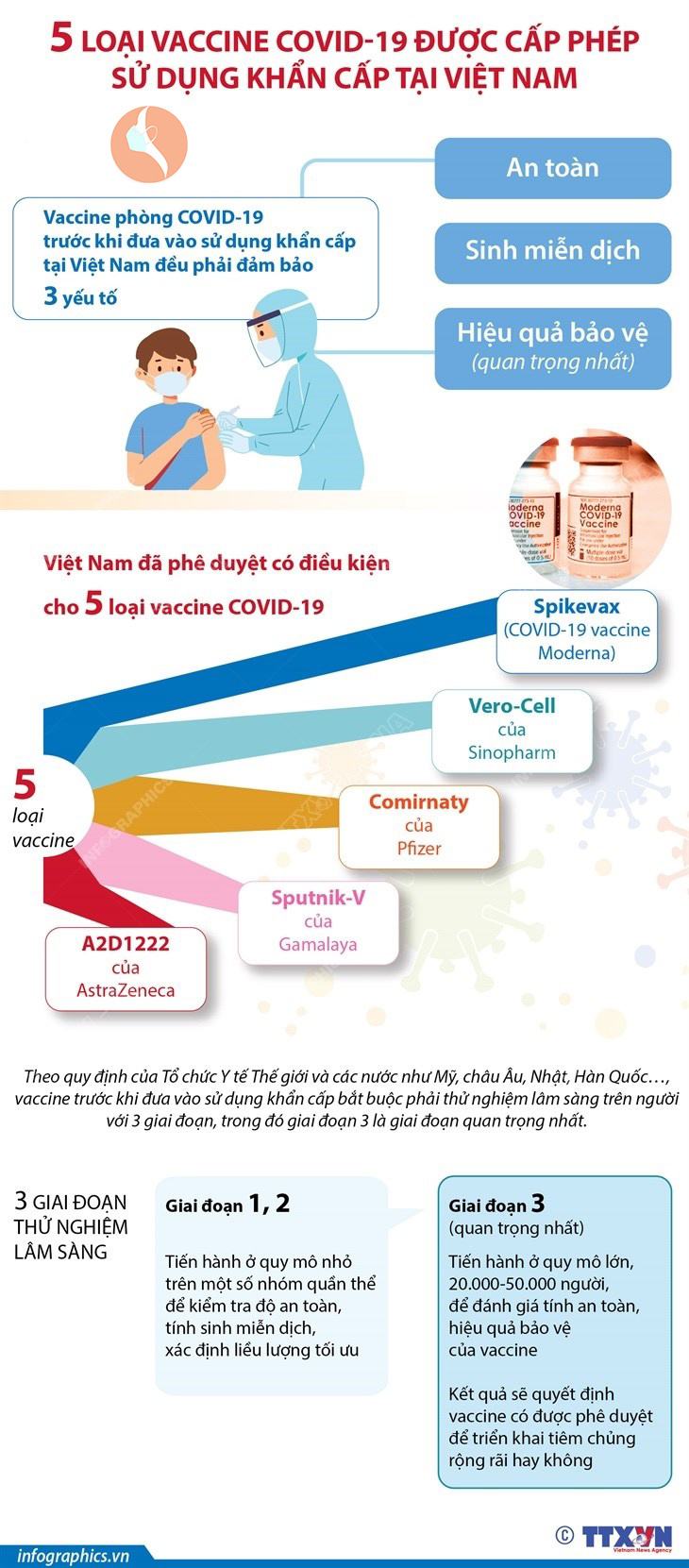 Bộ Y tế quyết định phê duyệt có điều kiện vắc xin cho nhu cầu cấp bách trong phòng, chống dịch bệnh COVID-19 theo quy định tại Điều 67 Nghị định số 54/2017/NĐ-CP ngày 8/5/2017 của Chính phủ quy định chi tiết một số điều và biện pháp thi hành Luật dược (Nghị định 54/2017/NĐ-CP) về việc cấp phép và sử dụng khẩn cấp 5 loại Vaccine Covid tại Việt Nam